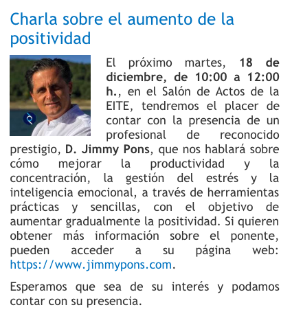 El próximo martes, 18 de diciembre, de 10:00 a 12:00 h., en el Salón de Actos de la EITE en la Universidad de Las Palmas, hablaremos sobre cómo mejorar la productividad y la concentración, la gestión del estrés y la inteligencia emocional, a través de herramientas prácticas y sencillas, con el objetivo de aumentar gradualmente la positividad. A los alumnos de la escuela de ingenieria telecomunicaciones y electrónica de Las Palmas